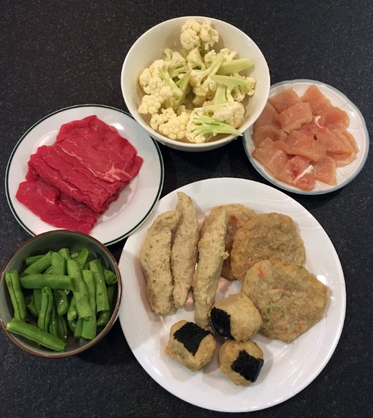 丸文雪衣天婦羅組1份、肉片2份、高麗菜半顆、南瓜適量、花椰菜適量、四季豆適量。