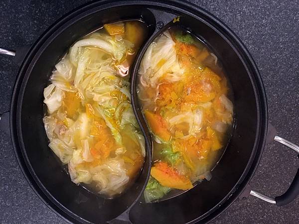 先用南瓜加高麗菜燉煮火鍋的高湯,等湯滾了之後,爽口的南瓜蔬菜火鍋湯底就完成了,是不是既健康又很簡單,完全不用加任何調味料,就有蔬菜的鮮味跟南瓜的甜味!