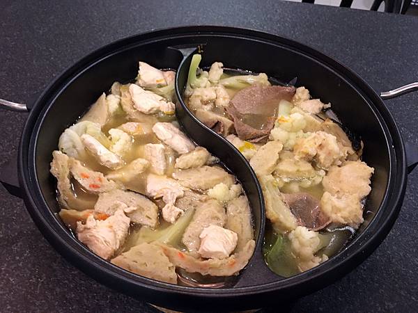 等南瓜蔬菜火鍋湯底完成後,記得要先把南瓜撈起來,不然南瓜煮久了,蔬菜火鍋湯底會變成稠稠的不好喝,然後再放入其他蔬菜和丸文火鍋料下去煮。