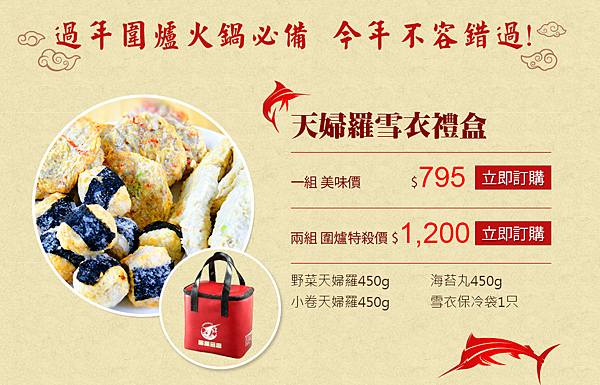 丸文火鍋料可說是過年圍爐必備的好良伴,而且丸文的雪衣天婦羅禮盒現正過年優惠中,超低的過年折扣價,買兩組更優惠,千萬不能錯過,立即搶購去>>>